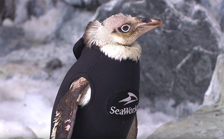 Облысевшая самка пингвина по имени «Чудесный Близнец» (Wonder Twin) из парка «SeaWorld» в Орландо (штат Флорида, США) пережила тяжелую болезнь, в результате которой потеряла все перья.Пингвины не могут жить без перьев — у них нарушается теплообмен, они теряют способность плавать и быстро умирают от болезни или становясь легкой добычей хищников. Но сотрудники центра не оставили девочку в беде и сшили ей специальный гидрокостюм. В нем она может вести нормальный образ жизни: плавать и спать.