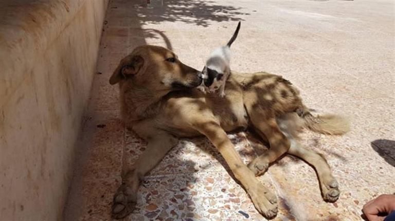 Мама-собака разрешает котенку-сыночку залазить на свою спину. Кажется, оба очень счастливы быть вместе. Очень хочется, чтобы у этой необычной семьи все было хорошо. И чтобы война в их родном городе поскорее закончилась.