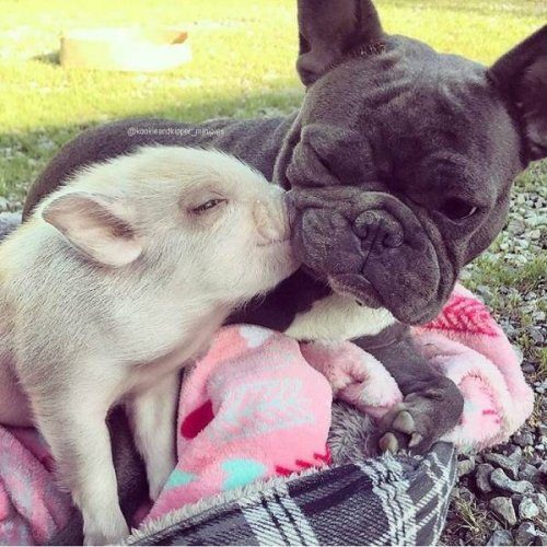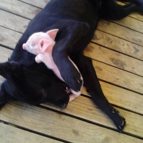 У меня пудель был в детстве, он очень любил наших свинок (в деревне у бабушки и дедушки). Любил с ними играть, носились по двору, как сумасшедшие. А из корыта ел с ними вместе так, словно ничего вкуснее никогда не пробовал!