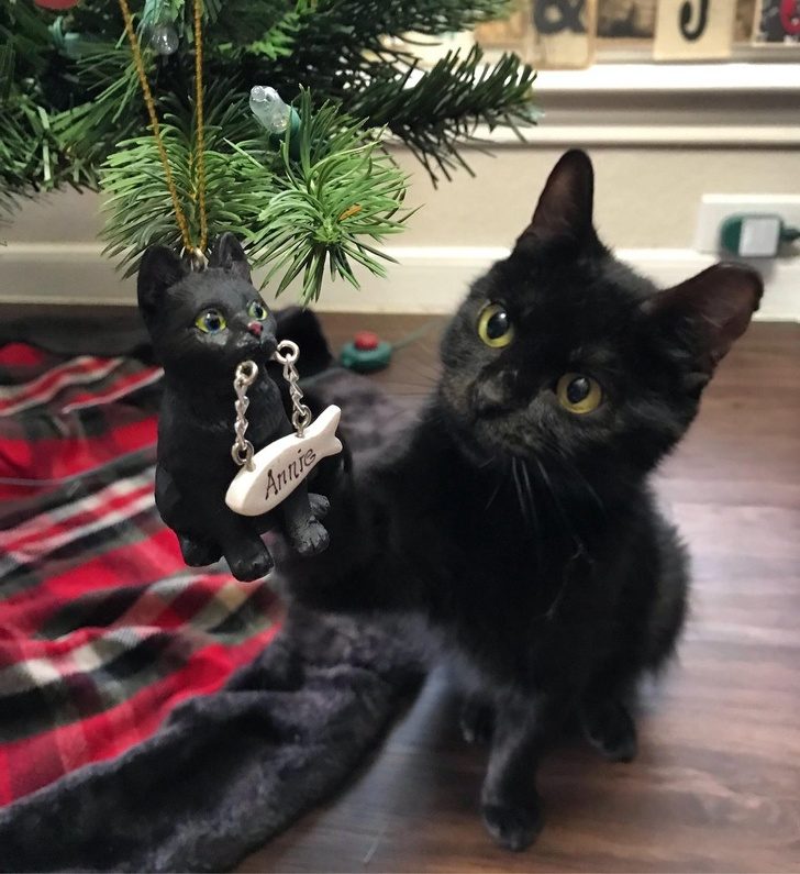 «Подарила спасенной мною кошечке елочное украшение в виде ее самой. Мне кажется, ей понравилось!»
