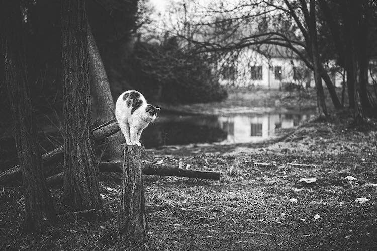 Портфолио фотохудожницы состоит из черно-белых снимков кошек, на которых видно, что для этих животных нет понятия неудобного или недостаточно широкого места. Их лапки помещаются везде: толстенькие пушистые котофеи восседают на верхушках высоких деревьев и «просачиваются» сквозь узкие заборы.