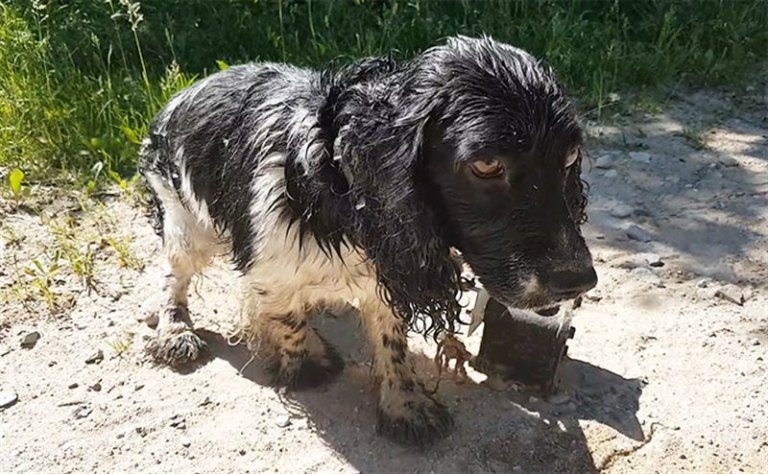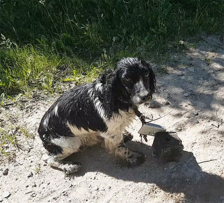 Подоспевшие на помощь люди освободили измученного пса от этого железного груза.