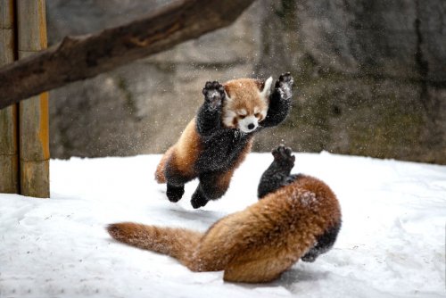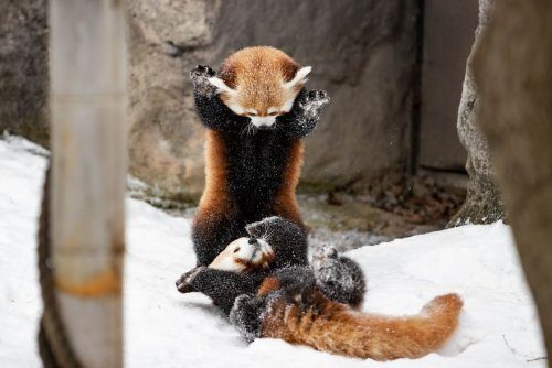 Наслаждаясь обычным снежным днём в зоопарке Розамонд Гиффорд (Rosamond Gifford Zoo) в Сиракузах, Нью-Йорк, она запечатлела на фотокамеру умилительную сцену с участием двух детёнышей красной панды, Люфа (Loofah) и Дуфа (Doofah)и, «жестоко дерущихся» в снегу.