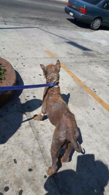 Карла Солис, проживающая в Мексике, подходила к своей машине и вдруг заметила, что под ней сидит живое существо, дрожащее от страха. Она долго выманивала животное из-под автомобиля, и когда ей это удалось, женщина увидела собаку замученную голодом и болезнью.