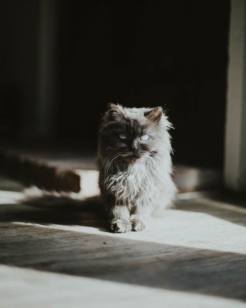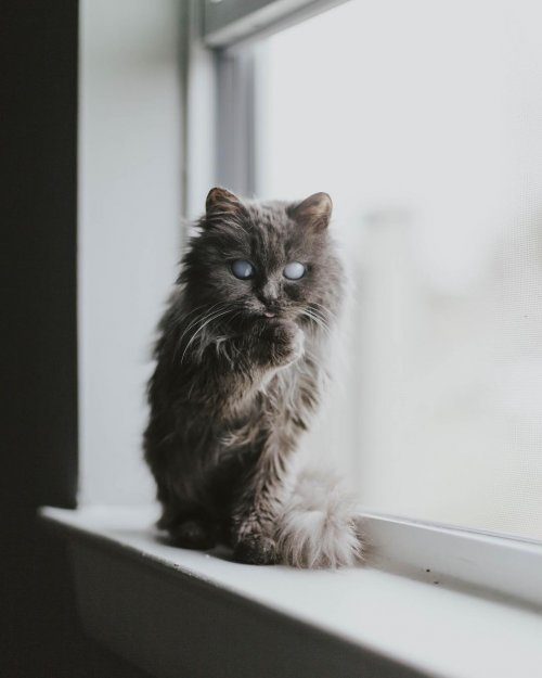 Мне тоже кажется, что котик слепой и да, что-то он не ухоженный какой-то, шерстка свалявшееся.