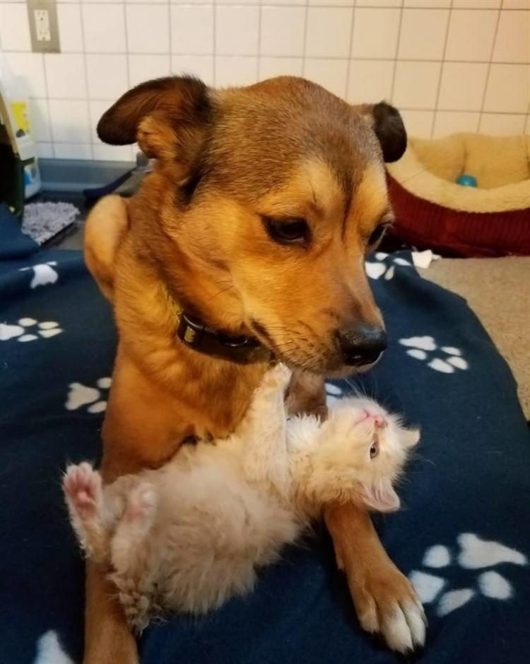 Собаке не составило труда заботиться о котятах. Наоборот, судя по тому, как он о них печется, можно с уверенностью сказать, что для Турбо помогать живым существам в радость.