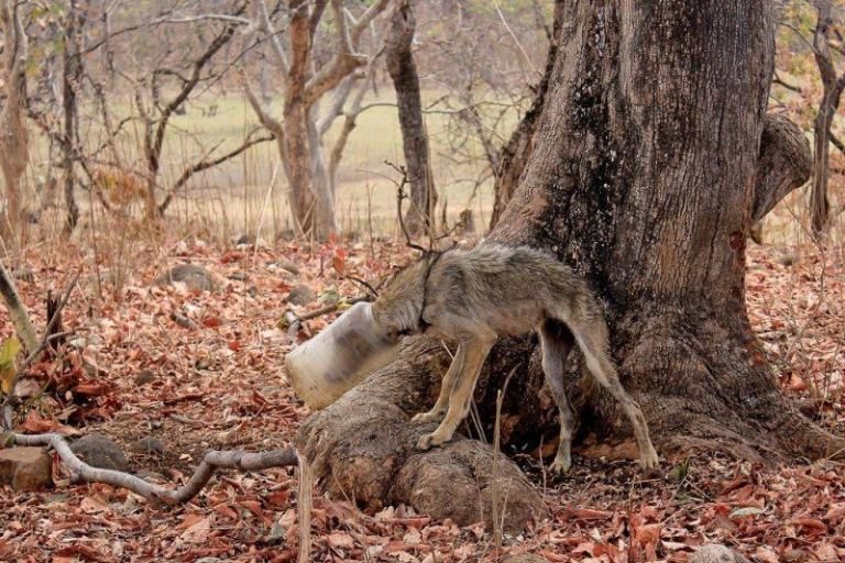 Случай произошел в Индии. Компания фотографов, снимавшая дикую природу в лесу, заметила щемящую сердце картину: к ним за помощью пришел молодой волк. Бедняга головой застрял в большой пластиковой банке и, не найдя спасения, решился обратиться к людям.