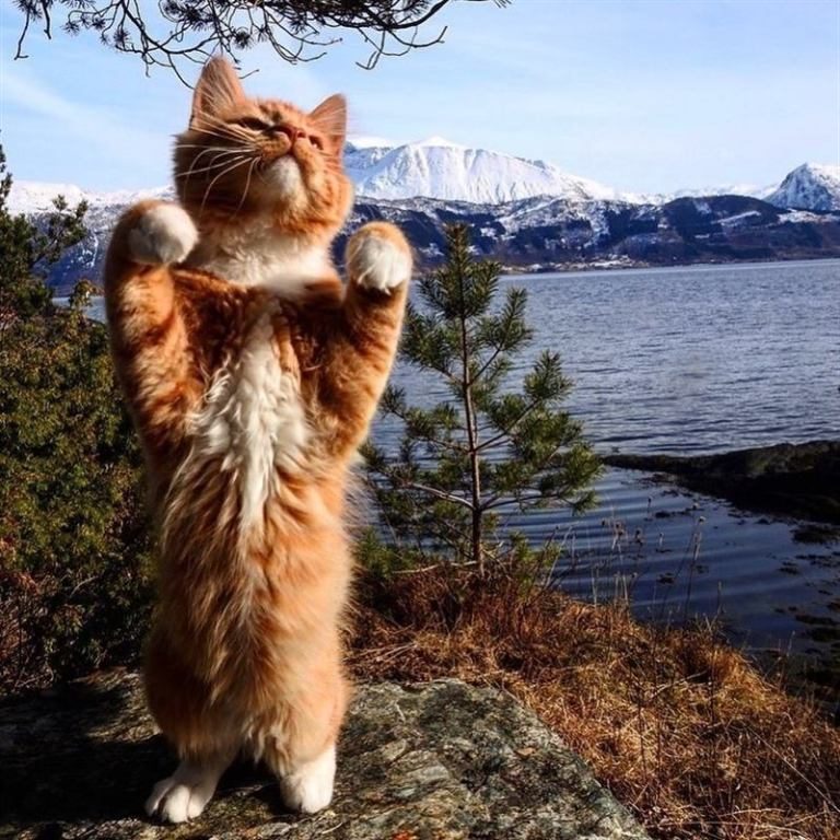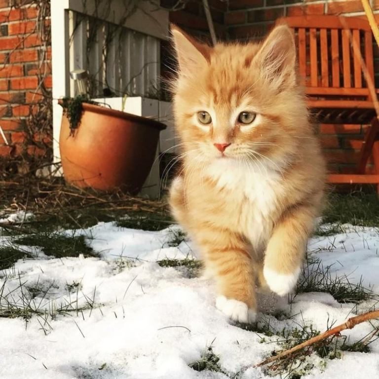 Сейчас коту уже не страшны ни снег, ни морозы. Примус важно шагает по тропинке и кажется, что все леса и фьорды принадлежат именно ему. Он обожает исследовать каждый уголок природы. Лене и Примус живут недалеко от леса. Ежедневно домашний питомец приносит своей хозяйке палочку или шишку.