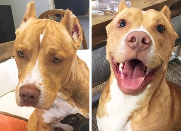 «Это мой пес за день до того, как мы его „усыновили“, и через несколько месяцев после этого».
