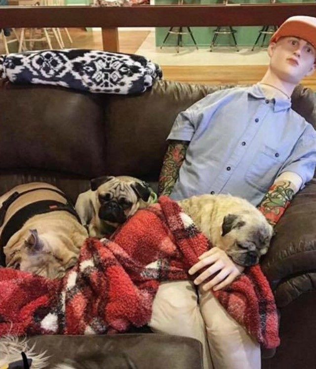 “Собаки моего друга очень нервничают, когда он уходит из дома. Поэтому друг придумал оставлять вместо себя манекен”.