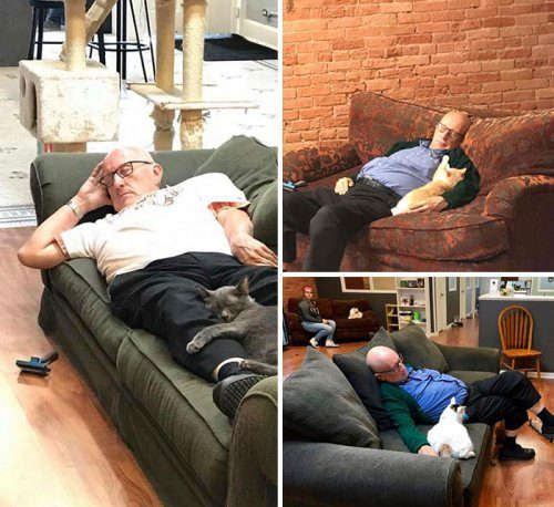 «Этот мужчина каждый день приходит в местный приют для кошек с особыми потребностями, чтобы вычесать шерсть и погладить их, и почти всегда засыпает вместе с ними»