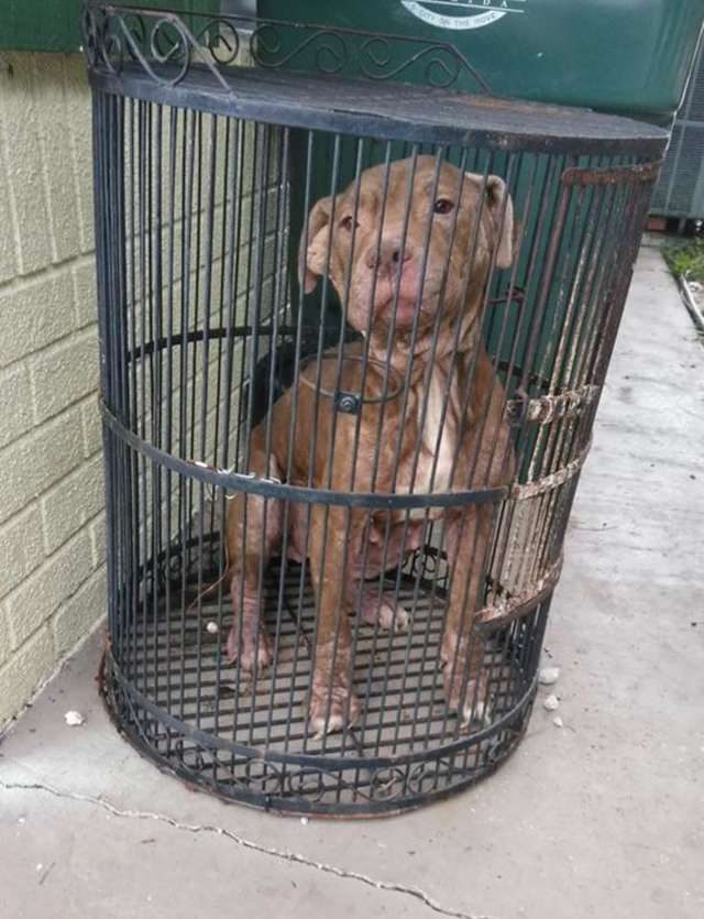 Непонятно, что было в голове у хозяев этого питбуля. Однако собачку нашли в клетке для птиц.
