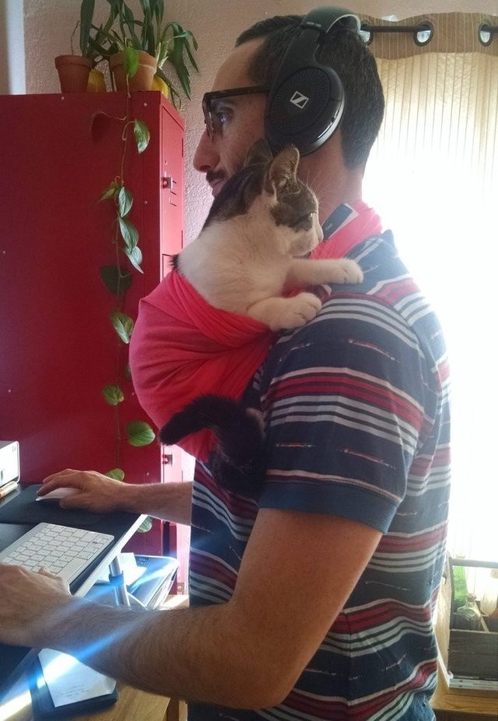 Клифф работает из дома. А его кот Саймон просится на руки тысячу раз за день. Пришлось сделать для него кошачий слинг