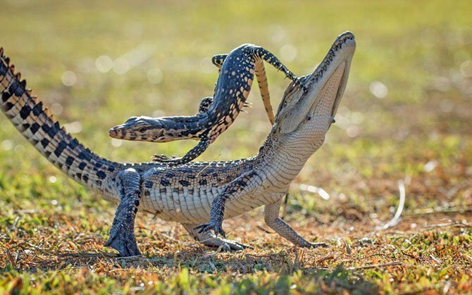 Акробаты. Ящерица перепрыгивает через маленького крокодила. (Фото Hendy MP):