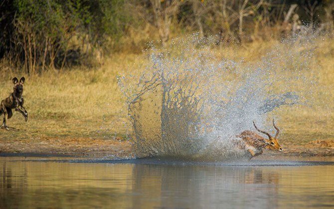 Двойное везение. Гиеновая собака гонится за импалой, та бросается в воду…