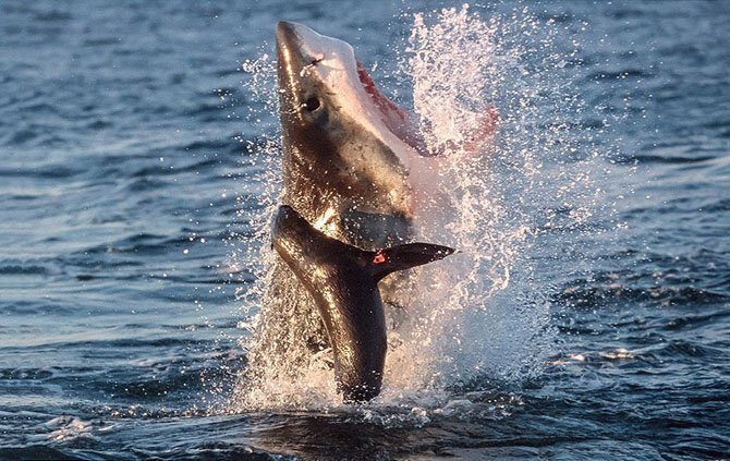 Большая белая акула ловит тюленя в Южной Африке. (Фото C & M Fallows):