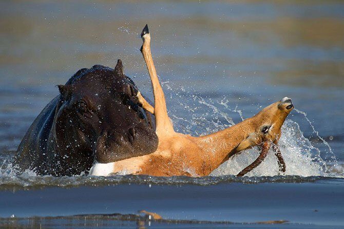 …и тут же попадается бегемоту. Тем не менее, импале удалось вырваться и добраться до берега. (Фото Hannes Lochner):