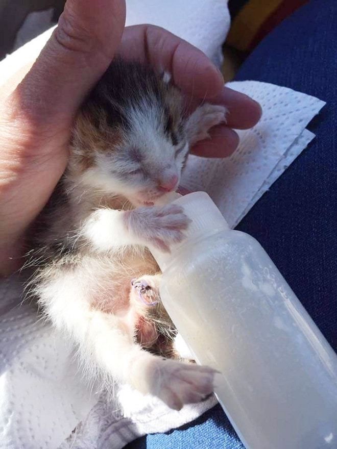Крохотное животное было в очень плохом состоянии: одна лапка была сломана, а остальные — поражены инфекцией. Девушка отнесла малыша к ветеринару. К несчастью, одну лапку спасти не удалось. Свои первые шаги котенку пришлось делать на трех лапках.