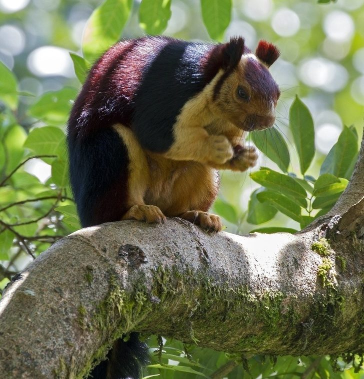 Индийская гигантская белка отличается не только необычным окрасом, но и размерами: длина тела составляет 36 см, а хвост — 61 см. Живут такие белки в одиночку или парами, но никогда не забывают про личный комфорт: они строят несколько шарообразных гнезд на деревьях, используя их для разных целей — для сна, отдыха или для размножения.