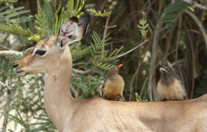 Буйволовых скворцов можно увидеть на больших травоядных: зебрах, бегемотах, жирафах, носорогах и т. д. Раньше ученые считали, что эта связь носит взаимовыгодный характер, но сейчас придерживаются мнения, что эти птицы больше паразиты, чем помощники. Скворцы питаются клещами, а также насекомыми, которые заводятся в ранах животных. Однако нередко птицы сами создают эти раны, расклевывая шкуру копытных. Но животным такое соседство не доставляет дискомфорта и они не стремятся прогнать этих птичек.