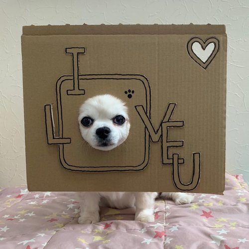 Девушка вырезает из картона маски, и, когда хочет сделать фотографию со своим питомцем в главной роли, она просто говорит «Иди домой!», и её маленький приятель просовывает свою мордаху сквозь отверстие.