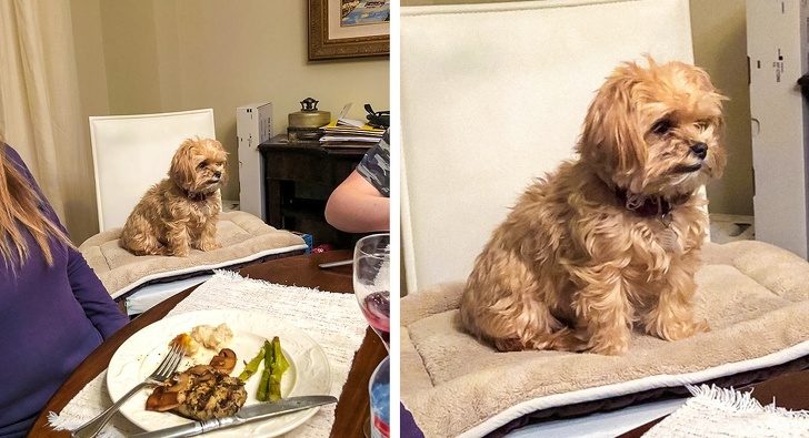 «Каждый раз, когда мы садимся ужинать, моя собака начинает скулить. Мы дали ей стул, чтобы она чувствовала себя более включенной в процесс»