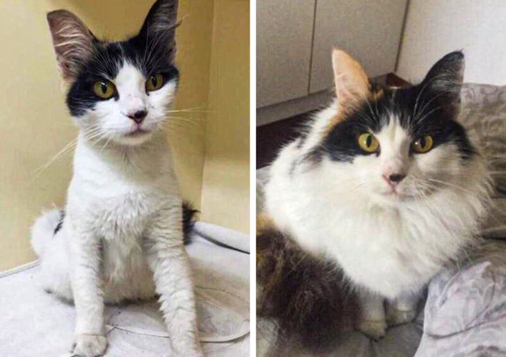 11. «Нашел эту красотку беременной и истощенной. Спустя несколько лет нашей заботы и любви она превратилась в толстенькую и пушистую кошечку»