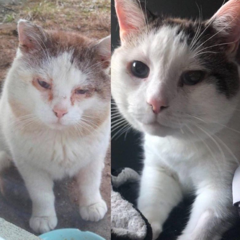 «Год назад мы нашли крошечного котёнка, брошенного в кусты. Он был покрыт блохами, у него была глазная инфекция, и он умирал от голода. Теперь он прекрасен!»