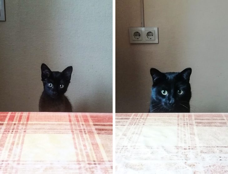 Домашние любимцы растут с невероятной скоростью. Не успеваешь и глазом моргнуть, как пушистый комочек превращается во взрослого полноценного члена семьи. Пользователи Reddit и паблика «кот растет» показали миру, как сильно изменились их питомцы со временем.