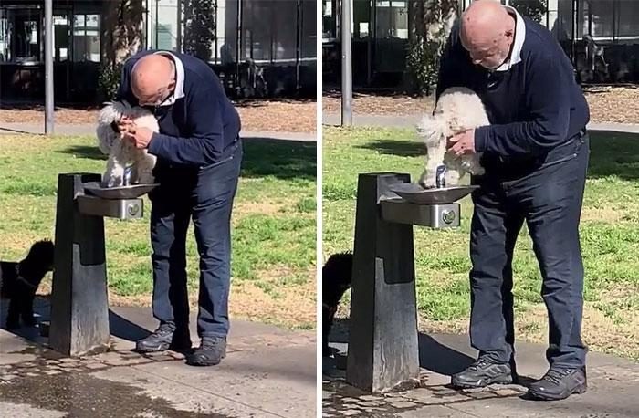 Хозяин решил помыть свою собаку в питьевом фонтанчике прямо посреди города