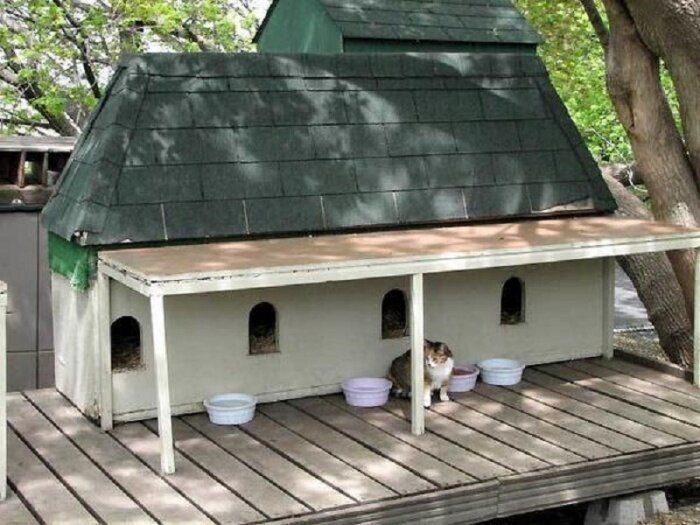 Для начала скажем, что приведённый образец достаточно неплохо продуман и предназначен для установки на личном участке, куда приходят подкормиться около 25 кошек. Попасть внутрь домика, где есть полки для отдыха и сено для тепла, кошки могут через небольшие лазы.