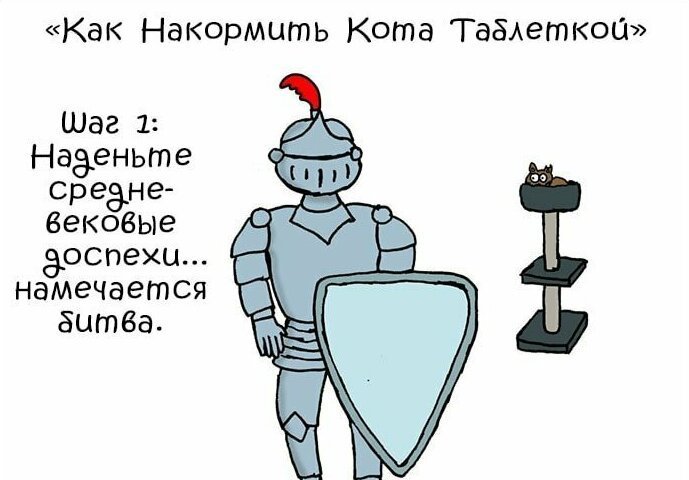 Смешно! Но реально у меня тоже не получилось давать кошке таблетки. Пасть не разжать, она из выплевывала, а в порошок растереть и маленьким шприцом влить тоже не вариант. Вот ветеринар — легким движением руки взял за холку, под нижней челюстью кожу оттянул, рот открылся и таблетка попала в цель! А я так не могу, мне жалко кошечке больно сделать, благо она не царапалась, но в отместку ходила по «своим делам» мне на пододеяльник, смотря мне прямо в глаза…
