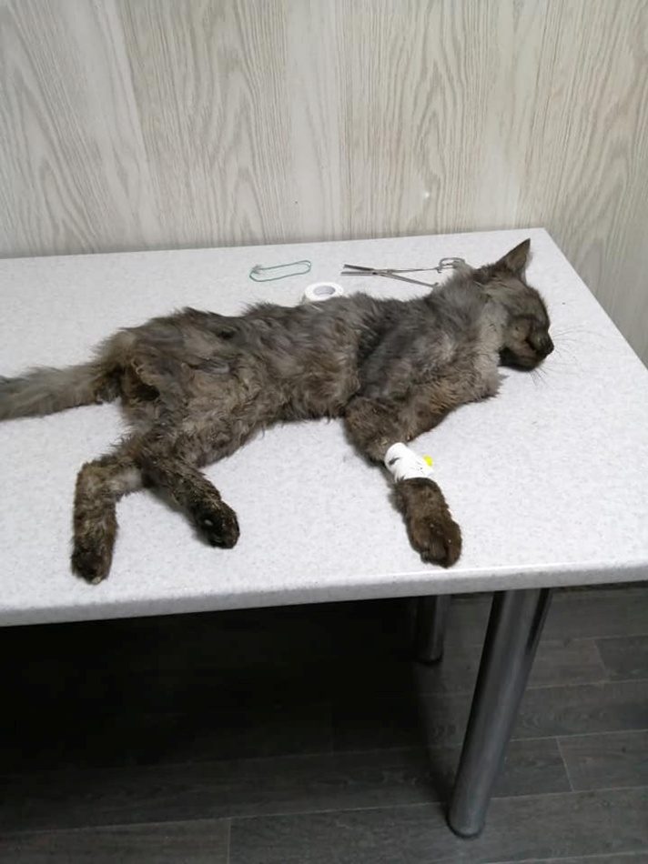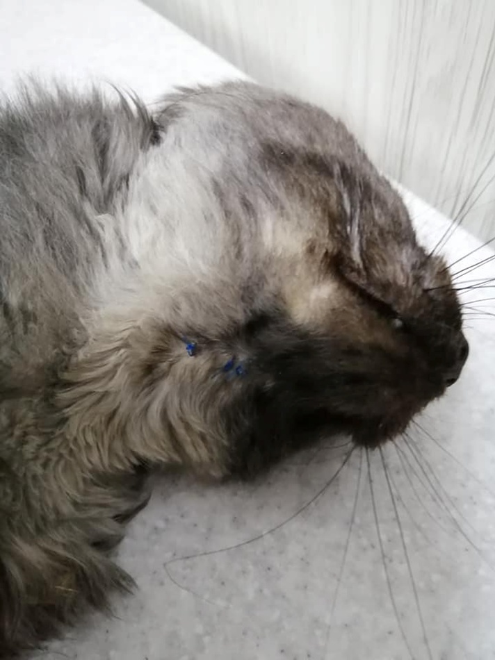 Животное было истощено, у него была температура 32 градуса. Усатый почти не подавал признаков жизни. Но даже не это было самым важным. Дело в том, что на шее у животного были вшиты в кожу медицинские нитки.
