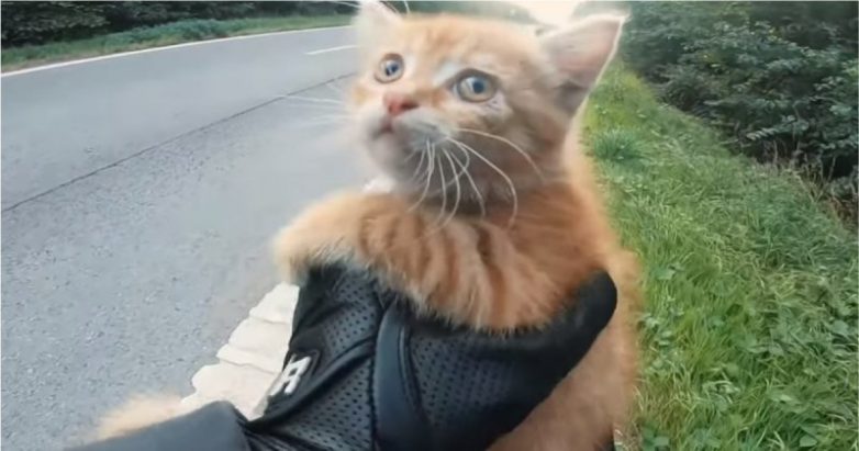 Проезжавший в окрестностях бельгийского города Монс мотоциклист заметил выбежавшего на дорогу рыжего котенка. Мужчина остановился и вместе с другим участником дорожного движения спас перепуганное животное.