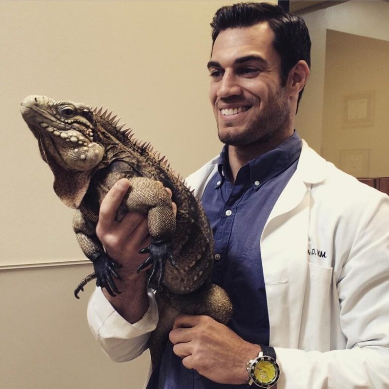Ветеринар путешествует по всему миру, но и дома его ждут зверушки — у Эвана живут собака, кот, степной варан, мангровая змея и множество тропических рыбок.