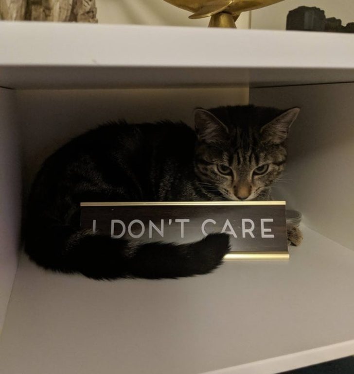 Надпись «Мне плевать». Универсальный кошачий ответ на человеческие правила.