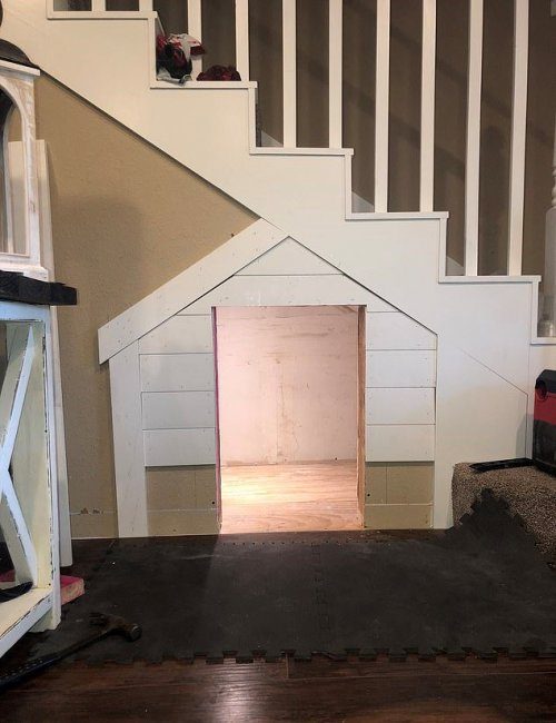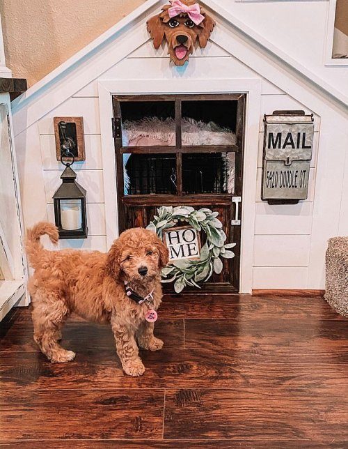 Вот пример еще одного такого домика, который обустроили у себя под лестницей владельцы милого щенка породы голдендудль — смесь пуделя и золотого ретривера.