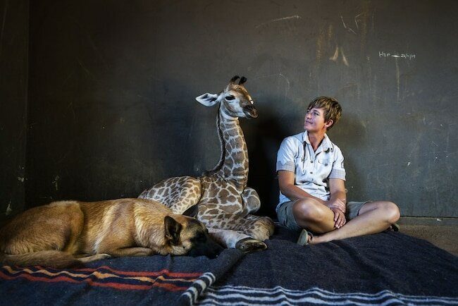 Джейни Ван Хеерден, работница приюта, находящегося в трёх часах езды к северу от Йоханнесбурга, рассказала, что животные сразу поладили и Хантер прижался к жирафe, как будто это была другая собака.