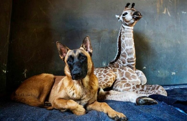 Собака в Южной Африке подружилась с маленьким жирафом, которого бросили при рождении, спасли и отвезли в местный приют.