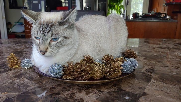 «У моей кошки в распоряжении есть куча мест, где она может спать. Но она выбрала тарелку с шишками»