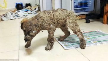 Из-за клея шерсть пса сильно слиплась и свалялась, в результате чего он оказался практически полностью загипсованным. Липкая шерсть была покрыта сухими ветками и жуткой грязью. Пострадали и уши собаки: туда также попал клей, лишив животное возможности слышать.