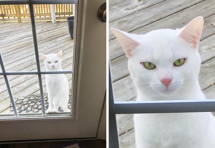 Будет сидеть и смотреть тебе прямо в душу, пока не сообразишь побежать и впустить кошечку домой