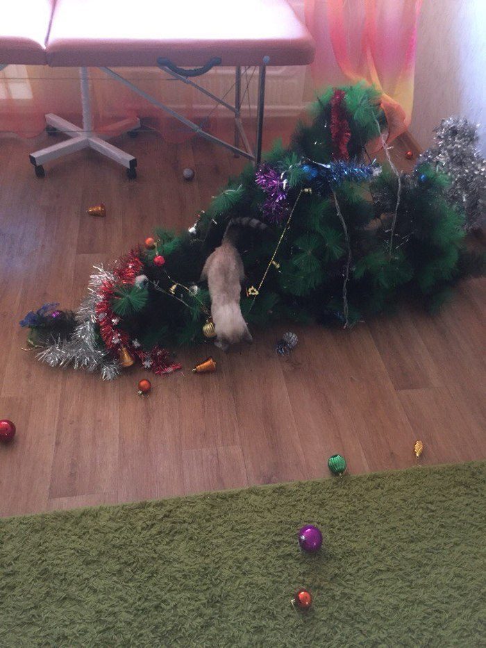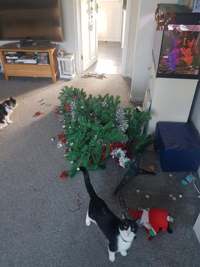 Наглые коты, которые свалили ёлку и остались жутко довольны собой