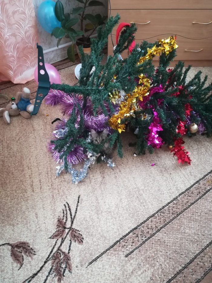 10. Довольно предсказуемо. Нужно было крепко привязывать. Только пока не понятно: кота или елку.