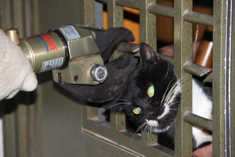 3. Пожарный спасает кошку, застрявшую в решетке двери.