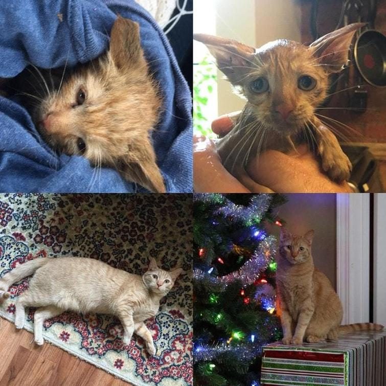 «Элвис родился в Коста-Рике, полный грибковой инфекции, из-за которой он потерял свою шерсть. Сегодня он здоровый мальчик, живущий с нами в Торонто»