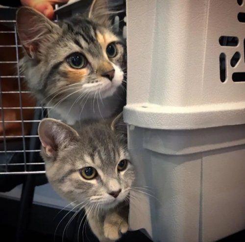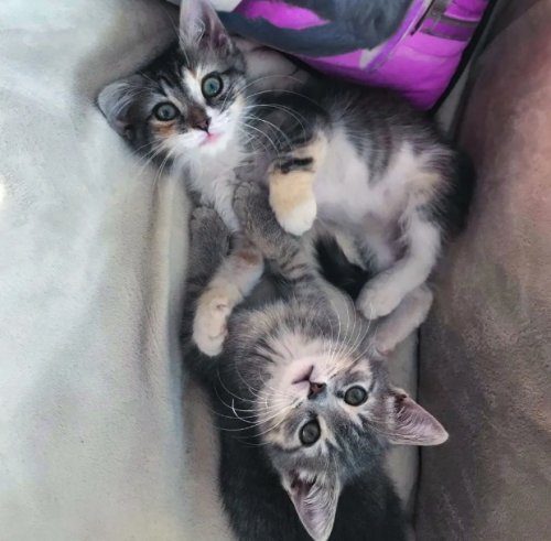 Местный спасатель программы TNR (поймать-стерилизовать-отпустить) из Монреаля, Канада, спас несколько котят из кошачьей колонии — двое из них были более слабыми, чем остальные. Они нуждались в медицинской помощи и большом количестве внимания. Котята, пятнистый и серый полосатый, быстро сблизились. Они были из разных пометов, с разницей примерно в 10 дней, но никогда не отходили друг от друга.