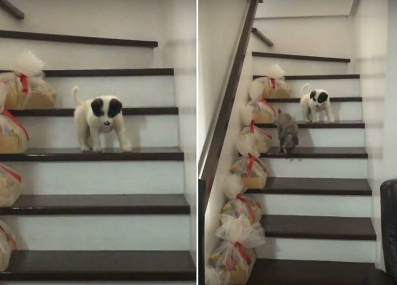 Лестница способна стать непреодолимой преградой даже для взрослой собаки, не говоря уже о щенке. Однако у этого малыша есть надежная подруга, которая всегда придет на помощь.