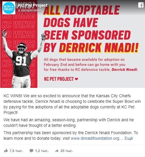 «Kansas City Chiefs ПОБЕДИЛИ! Мы очень рады сообщить, что защитник команды Kansas City Chiefs Деррик Ннади решил отпраздновать победу в Суперкубке, заплатив за усыновление всех собак, доступных к усыновлению в настоящее время в KC Pet Project!