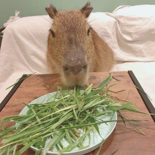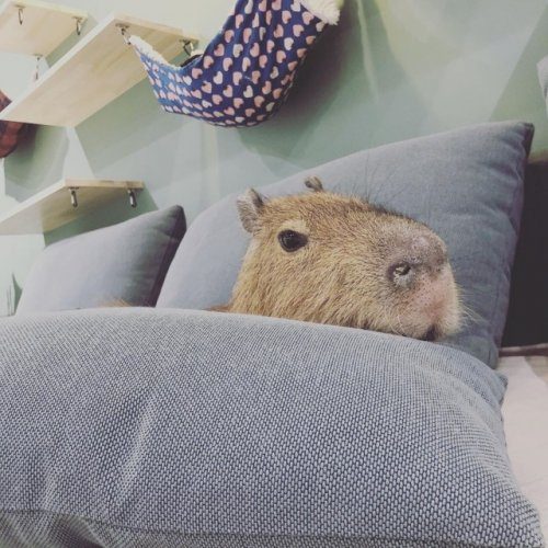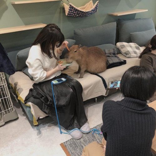 Главным конкурентом за внимание посетителей этого японского кафе, стала капибара. Огромный грызун, которого зовут Таваши. Несмотря на свой грозный вид, капибары очень дружелюбные зверьки, которые легко привыкают к людям и идут на контакт со всеми посетителями кафе им на радость.